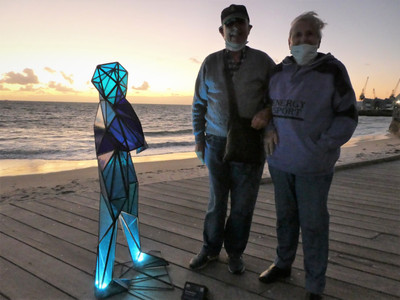 Bathers Beach is near the Fisherman's Wharf in South Fremantle. We visited in the evening and enjoyed a fishy meal at a nearby restaurant first. The sculptures are installed along the beach and lawns and stretch beyond the Round House. We didn't wander to the extreme but thoroughly enjoyed the ones on the sand. It was dusk by then so we could see the benefit of the lighting incorporated into the Sculptures. The Fremantle Doctor accompanied us on our meanderings.